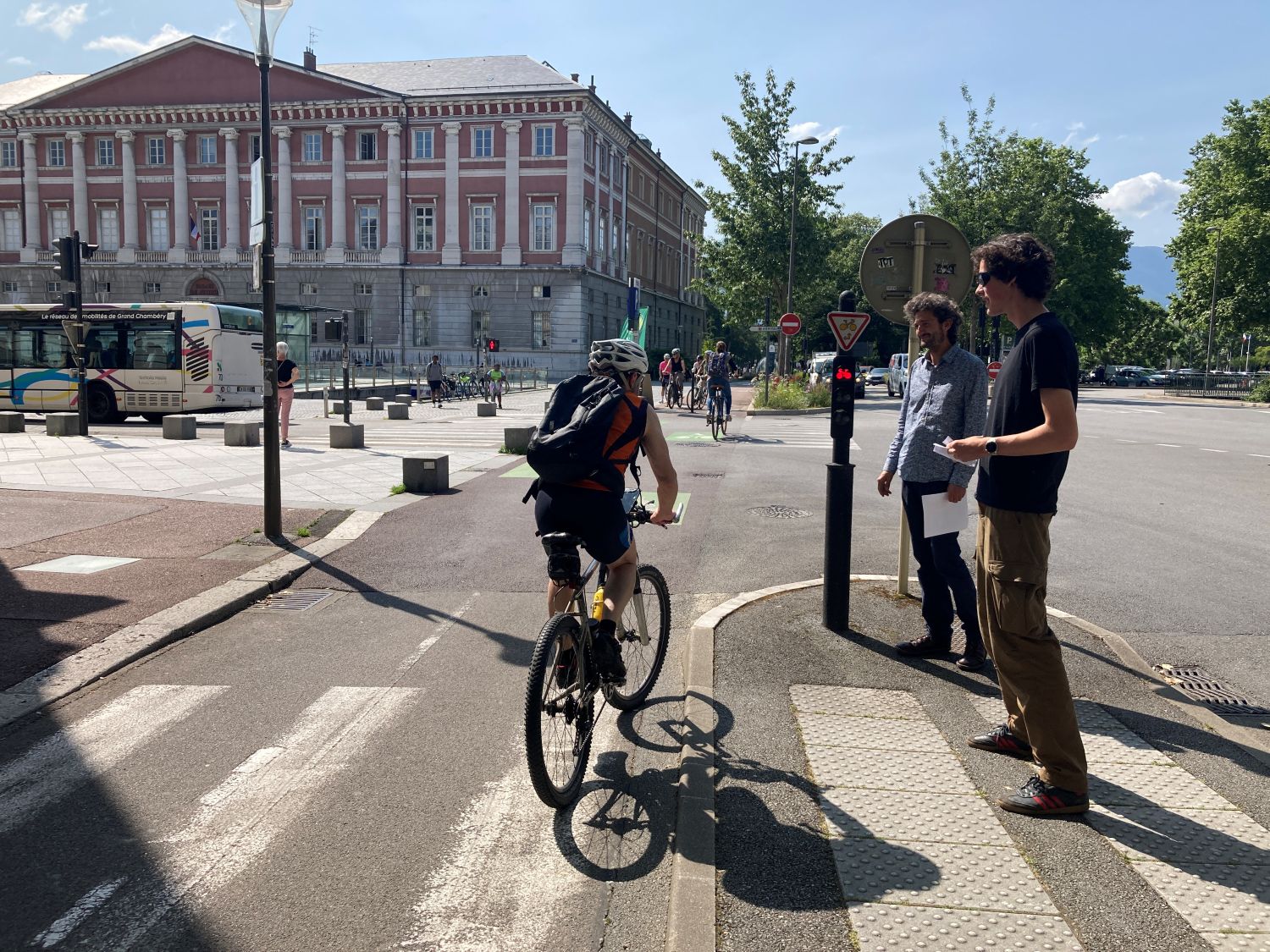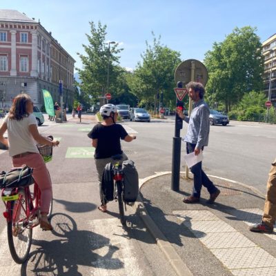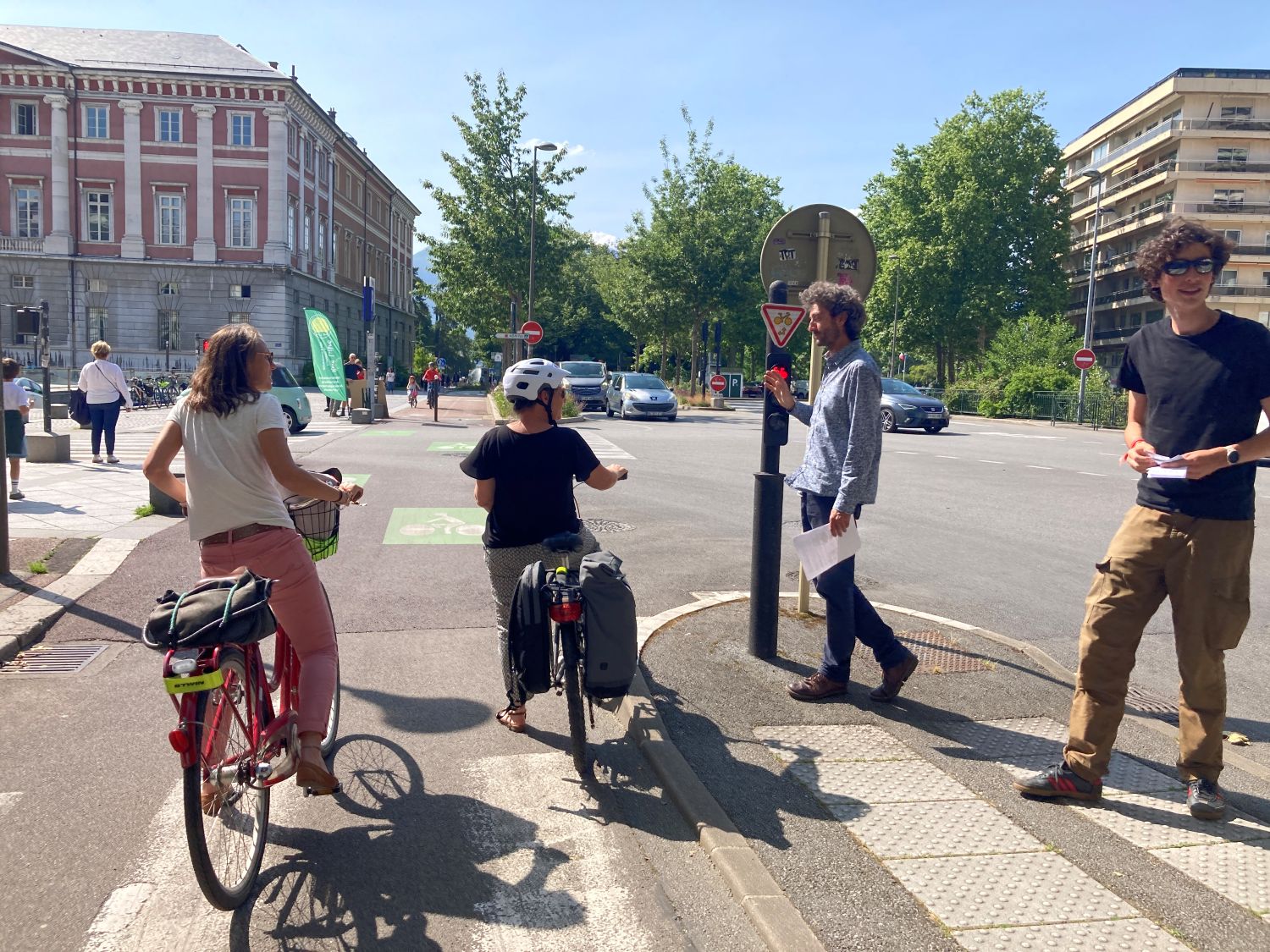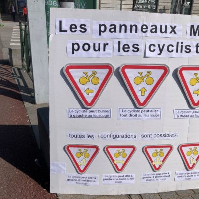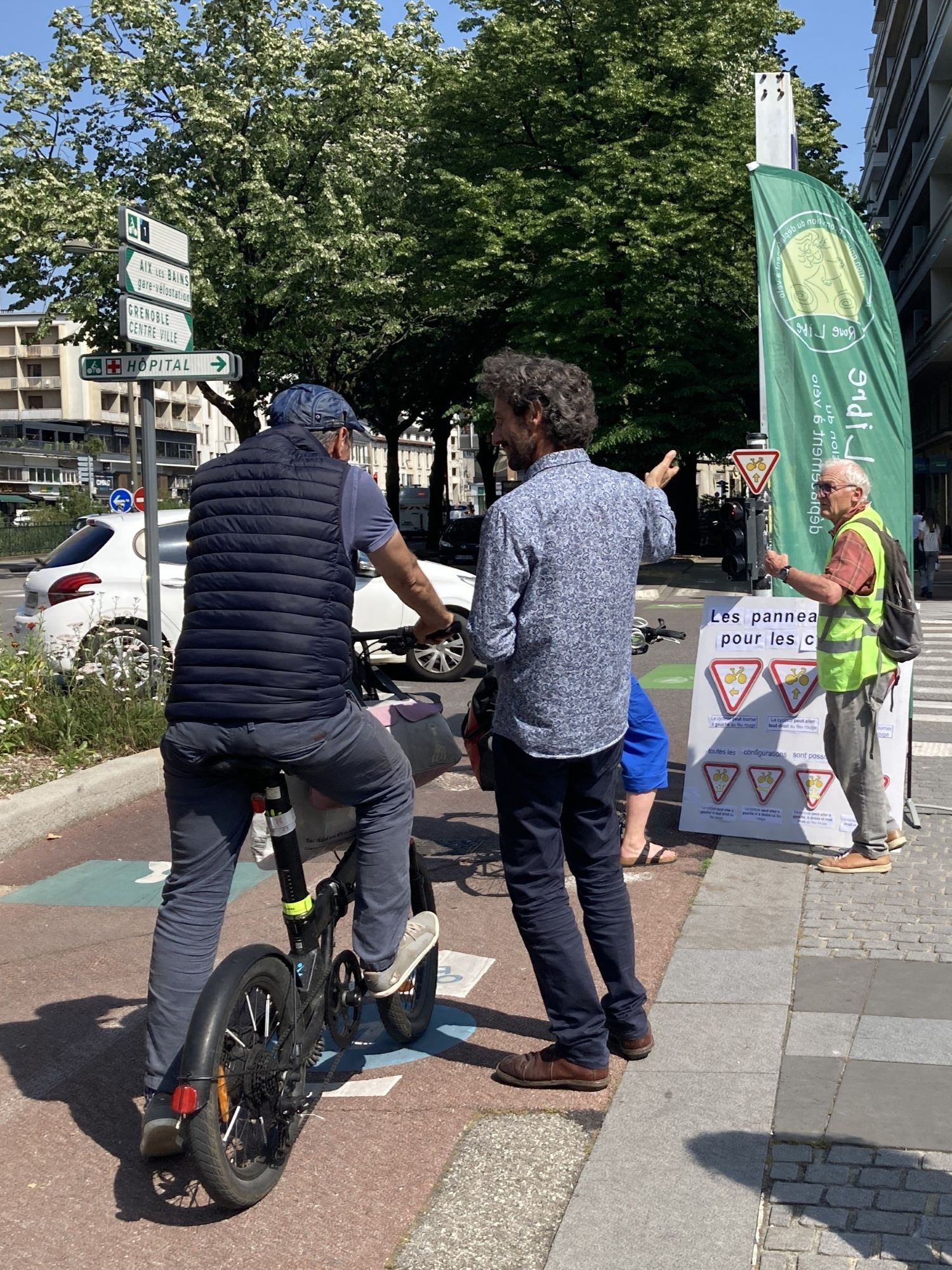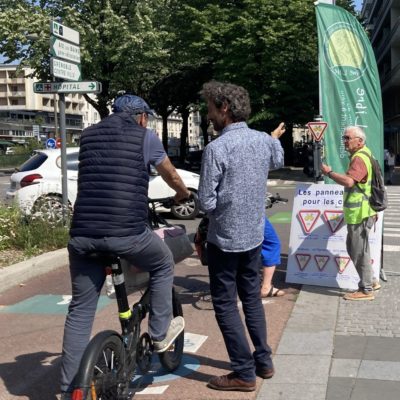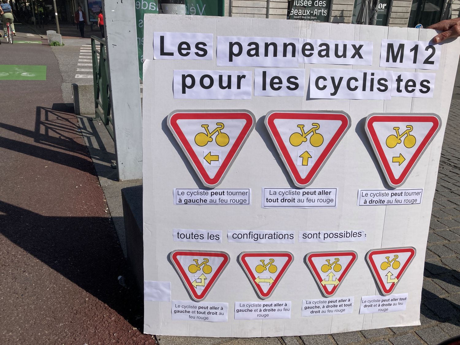 Roue Libre a organisé une action de sensibilisation des cyclistes aux nouveaux panneaux Cédez-le-passage aux feux pour les cyclistes le mardi 3 juin place du palais de justice à Chambéry.