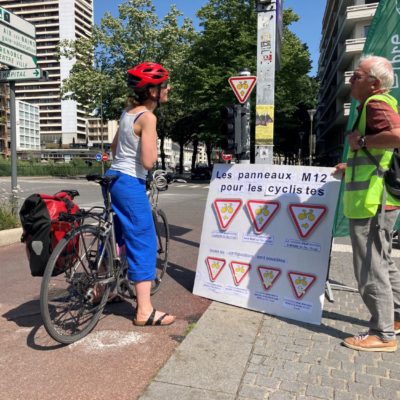 Le panneau dit “M12” est un cédez-le-passage cycliste, introduit dans le code de la route en 2010 à l’issue de plusieurs expérimentations et retours d’expérience très positifs.