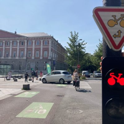 Les cyclistes qui franchissent le feu rouge en accord avec cette signalisation doivent cependant impérativement céder le passage aux voitures, cyclistes et piétons qui bénéficient d’un feu vert.