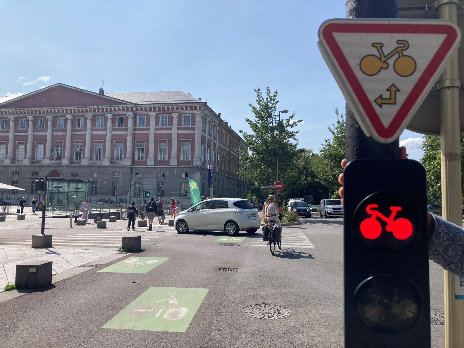Ces panneaux autorisent les cyclistes à franchir les feux rouges en cédez le passage, pour tourner à droite mais aussi depuis 2025 (et c’est une nouveauté à Grand Chambéry) sur certains feux pour aller tout droit et / ou à gauche. Objectifs : fluidifier le trafic, sécuriser les déplacements et encourager le vélo.