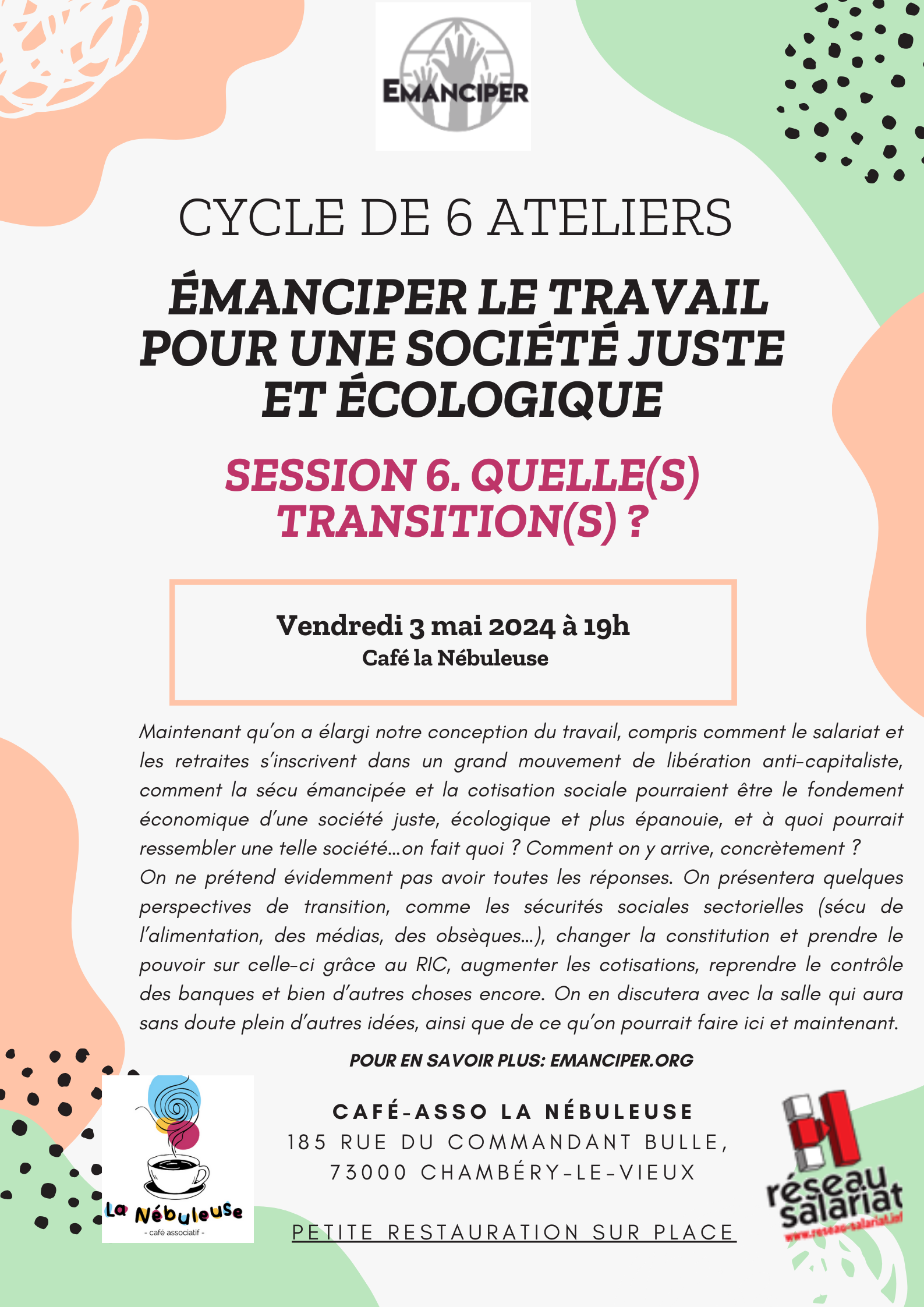 Après l’introduction à la démocratie réelle, Émanciper / Réseau Salariat Les 2 Savoie lance un nouveau cycle d‘ateliers d’éducation populaire. Venez apprendre et discuter sur l’économie et la transformation sociale, et repartez avec des clefs pour changer la vie et sortir de notre impuissance collective. Un autre monde, plus juste et écologique est possible et urgent. Pour cela, il faut penser le monde actuel et préparer le monde futur ; c’est ce que nous vous proposons de faire ensemble en 5 ateliers qui suivent une progression logique.