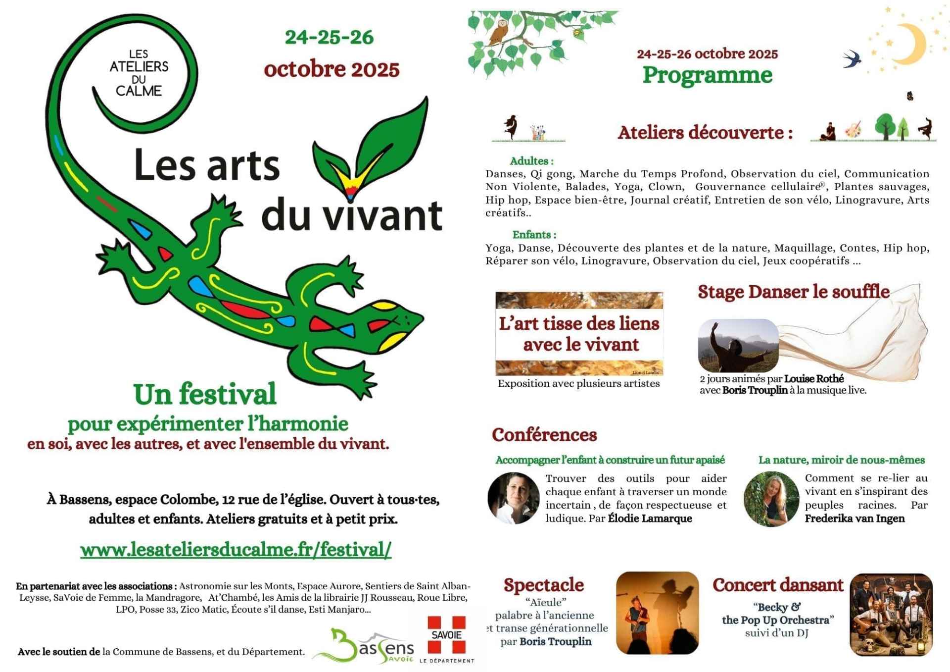 On y trouvera une vingtaine d’ateliers découverte et des conférences, autour du lien au vivant, de la créativité et de la santé (corps-cœur-esprit), un spectacle, une exposition de plusieurs artistes, ainsi qu’un stage “Danser le Souffle” . Une soirée festive est prévue le samedi soir, pour créer de la convivialité et de la joie partagée : Becky and the pop up orchestra, suivi d’un DJ. La clôture le dimanche en fin d’après-midi sera surprise, et festive elle aussi !