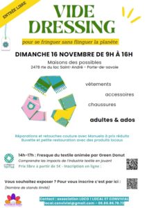 L’association des LOCOS ! (local et convivial) organise un vide dressing (pour se fringuer sans flinguer la planète) au cours duquel est proposée une Fresque du Textile animée par Green Donut.