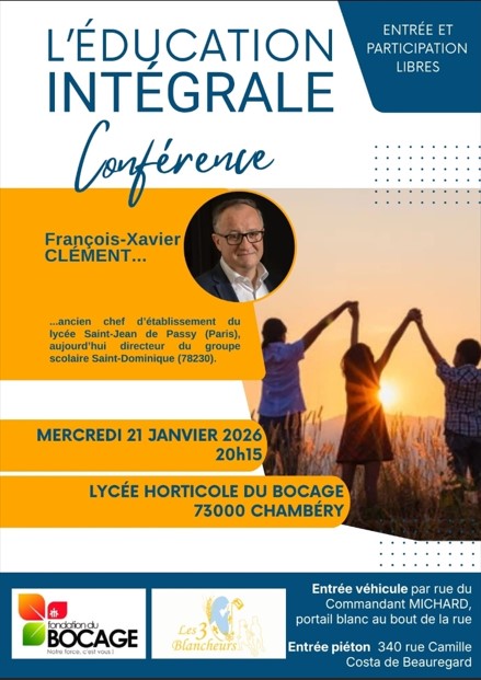 C’est le pari de l’éducation intégrale que François-Xavier CLEMENT, ancien chef d’établissement du Lycée Saint Jean de Passy et directeur du groupe scolaire Saint Dominique, viendra présenter le 21 janvier à 20h15 au Bocage.