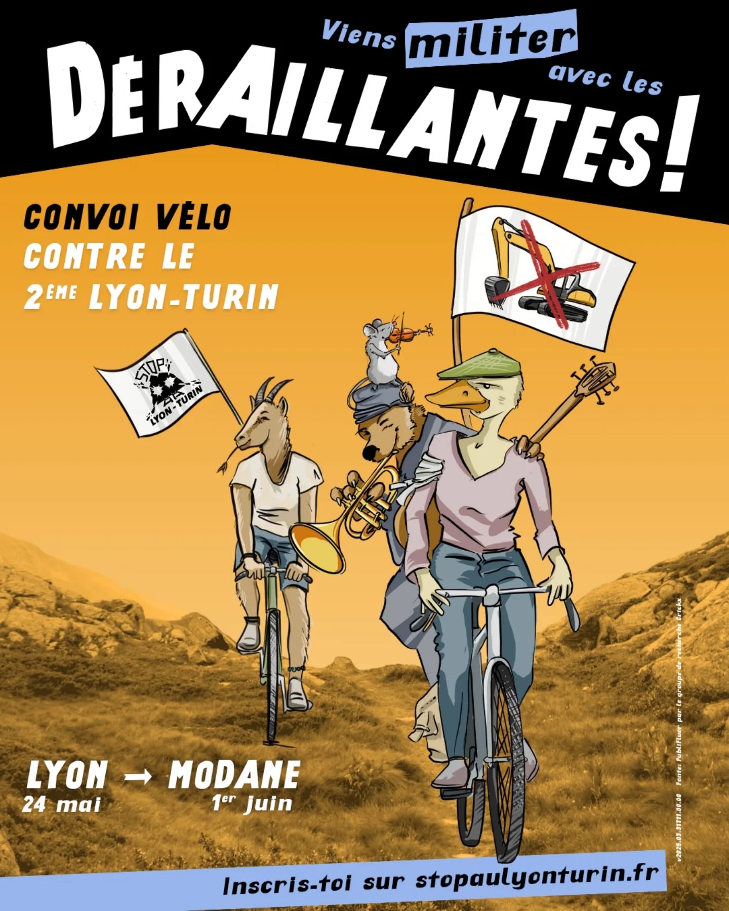 Alors pour prendre le contrepied de la vitesse, et aller à la rencontre des habitant.es futur.es expropriées ou voisin.es des nuisances du chantier, Les Déraillantes t’invite à un convoi vélo entre Lyon et Modane, du 24 Mai au 1er juin.