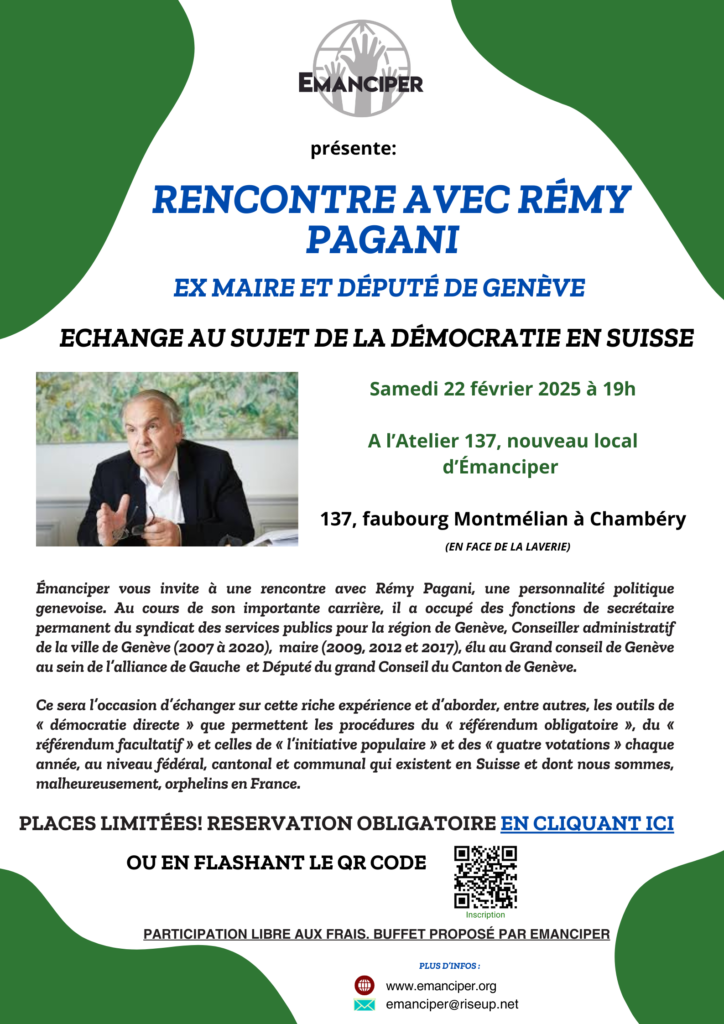 Émanciper vous invite à une rencontre avec Rémy Pagani, une personnalité politique genevoise. Au cours de son importante carrière, il a occupé des fonctions de secrétaire permanent du syndicat des services publics pour la région de Genève, Conseiller administratif de la ville de Genève (2007 à 2020), maire (2009, 2012 et 2017), élu au Grand conseil de Genève au sein de l’alliance de Gauche et Député du grand Conseil du Canton de Genève.