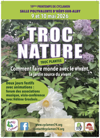 Le prochain TROC NATURE de CYCLAMEN CHÉRAN BAUGES ENVIRONNEMENT aura lieu les 9 et 10 mai prochains à la salle polyvalente d’Héry sur Alby.