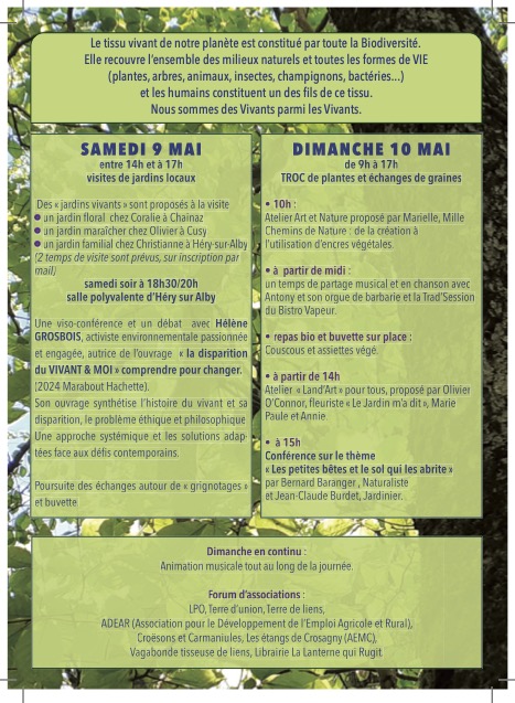 Le samedi à 18h30 dans la salle polyvalente d’Héry sur Alby, VISIO CONFÉRENCE ET DEBAT AVEC HÉLÈNE GROSBOIS, activiste environnementale passionnée et engagée, autrice de l’ouvrage « la disparition du VIVANT & MOI » comprendre pour changer.