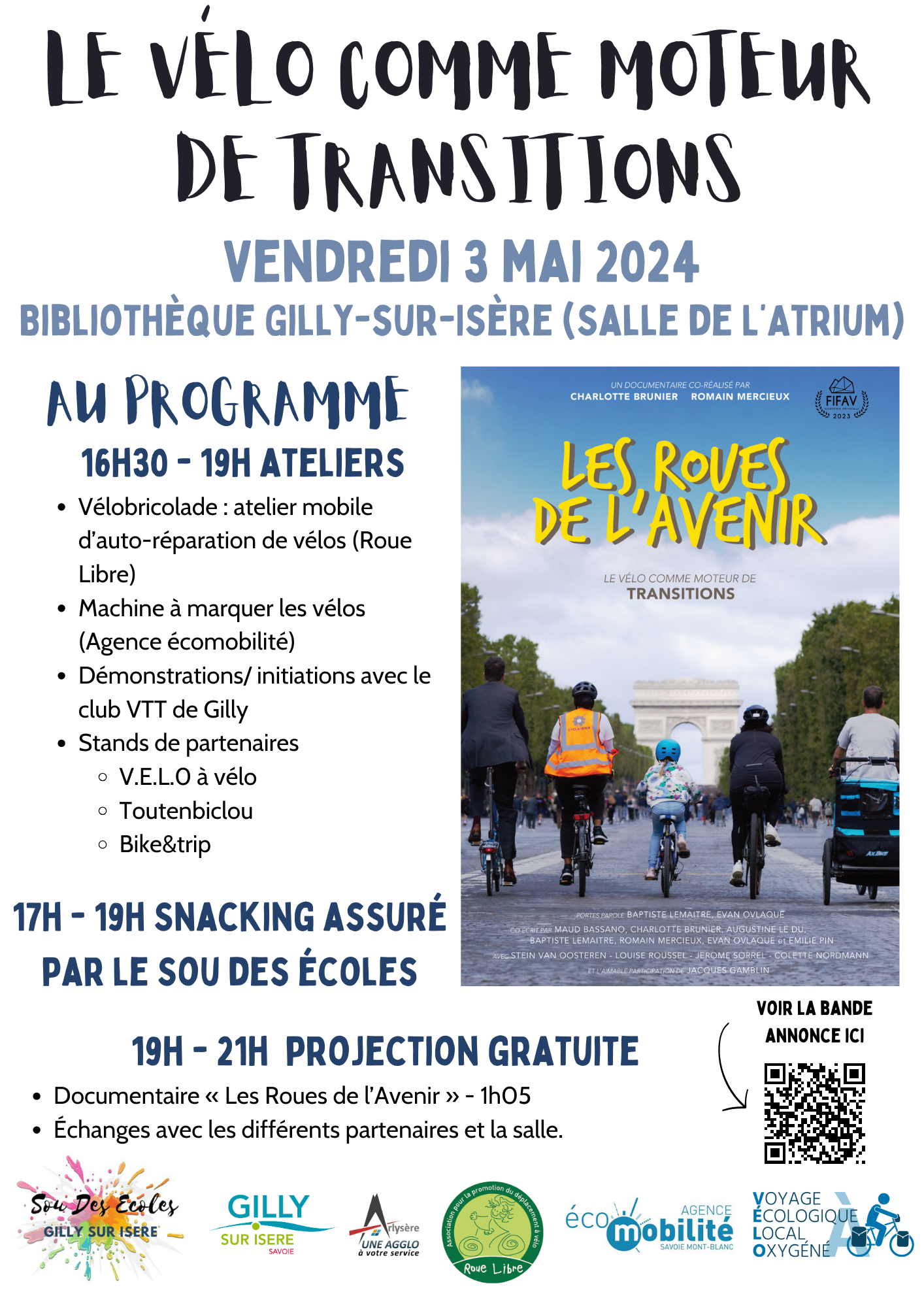 A l’occasion de « Mai à Vélo », plusieurs structures (Roue Libre, V.E.L.O à vélo, la Bibliothèque de Gilly-sur-Isère, avec le soutien d’Arlysère) se sont rassemblées pour co-organiser une après-midi d’ateliers et de stands. Elle sera suivie d’un ciné-débat autour du film « Les Roues de l’Avenir », qui avait fait carton plein à Malraux à Chambéry!