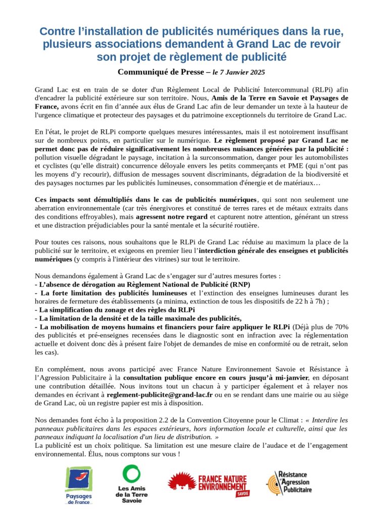 Note : vous pouvez aussi contacter les Amis de la terre en Savoie : savoie@amisdelaterre.org qui vont faire des propositions sur ce sujet et déposer dès à présent votre avis en demandant par exemple le fait de ne pas avoir de publicités ou d’enseignes numériques, de simplifier les zonages et de faire respecter dès à présent les lois en matière de réglementation (70 à 74% des enseignes et panneaux sur Grand Lac sont aujourd’hui illégaux d’après le diagnostic)